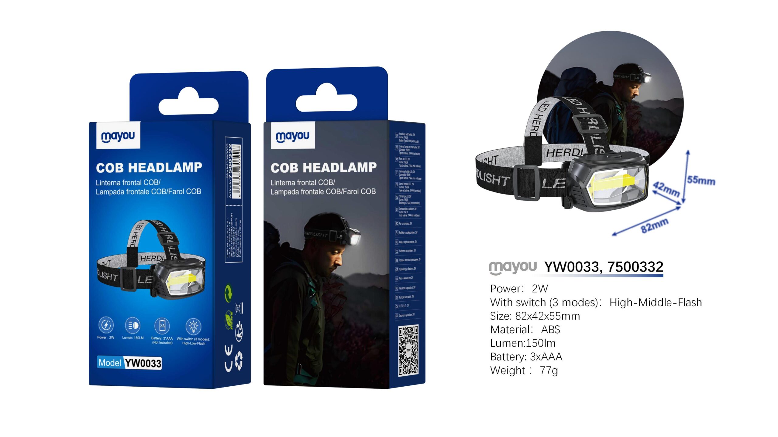 YW0033 NE Linterna Frontal led COB 2W/150lumenes, 3 modos(Alto/Bajo/Funcion de destello), Bateria AAA*3 No incluido
